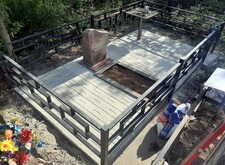 На ткань рассыпаем пескобетонную смесь, после чего закладываем площадь места захоронения бетонной плиткой. Покрытие замываем, затем ждём, пока раствор засохнет и схватится. Все работы по укладке покрытия были проведены при помощи уровня, так что какие-либо неровности или впадины на плитке абсолютно исключены.